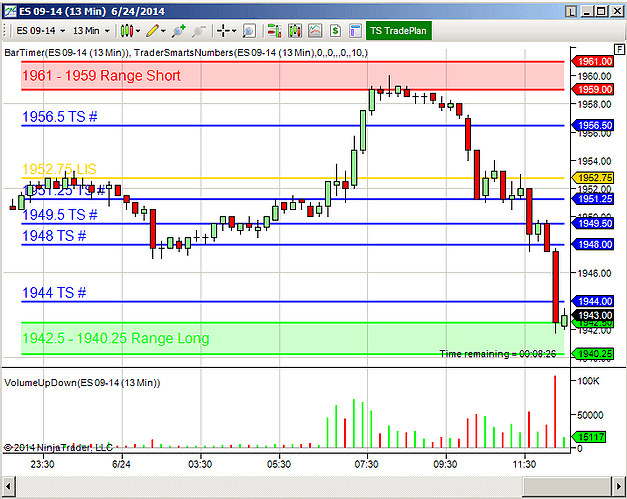 The TS TradePlan Indicator, available for NinjaTrader 7, NinjaTrader 8, SierraChart, TradeStation, eSignal, MultiCharts and MultiCharts.NET platforms, enables automatic plotting of the current day's TS #'s and Execution/Target Zones on to your charts.