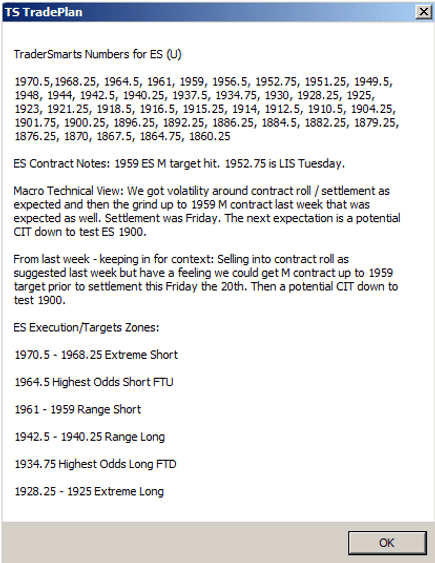 With one simple click traders can quickly glance at the day's compete TS TradePlan, including all of the TS #'s, Contract Notes, Macro Technical View, and Execution/Target Zones, in the same written format as the TraderSmarts desktop app, right from chart.